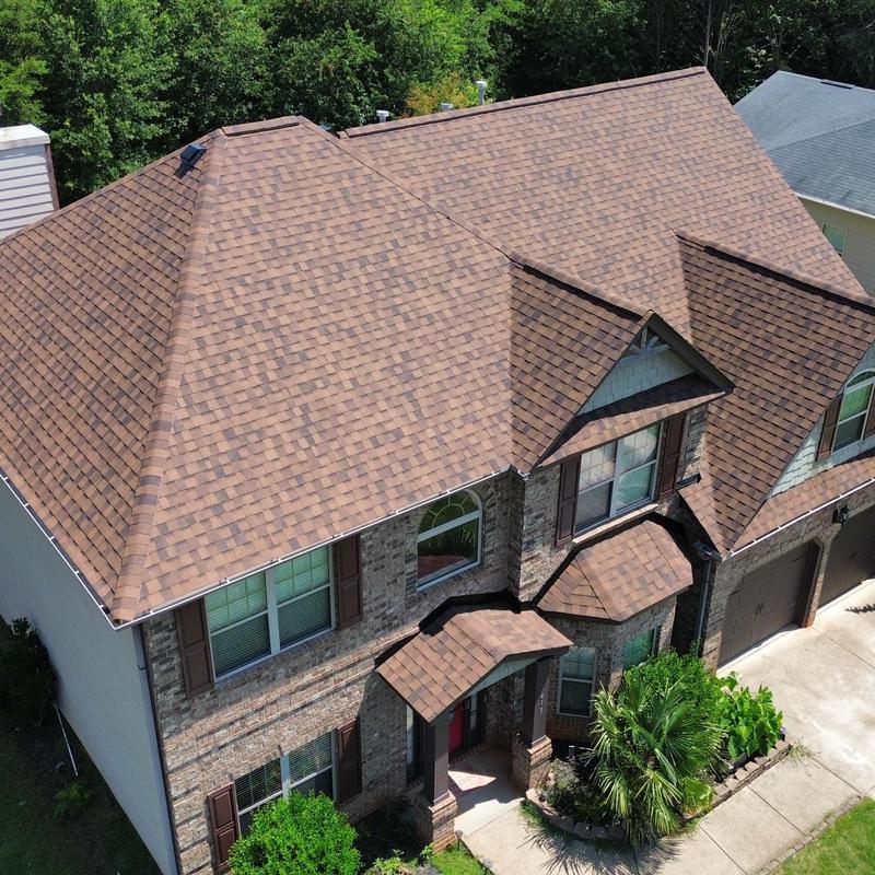 Consumer First Roofing completed a full roof replacement on a 5,500-square-foot home in Greenville, South Carolina. The team replaced damaged boards and installed new Atlas Pinnacle Hearthstone shingles. The project was finished in two days.