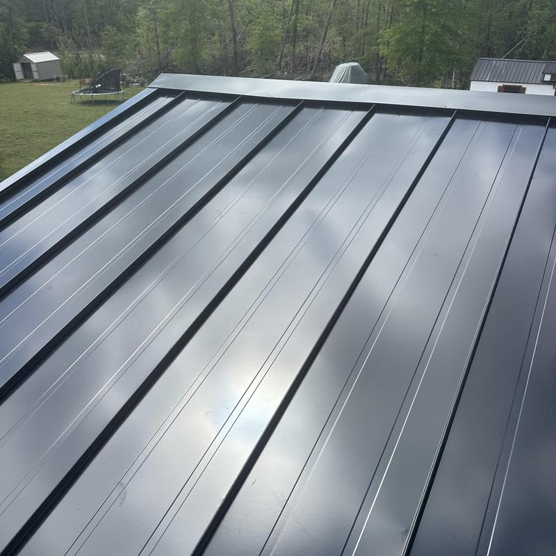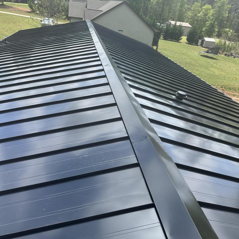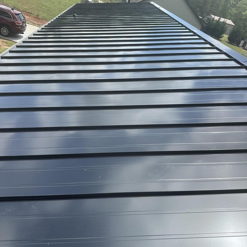Consumer First Roofing installed a standing seam metal roof after wind damaged the original shingles. The new roof includes a 50-year color warranty and a 10-year workmanship warranty. This project took place in Landrum, South Carolina.