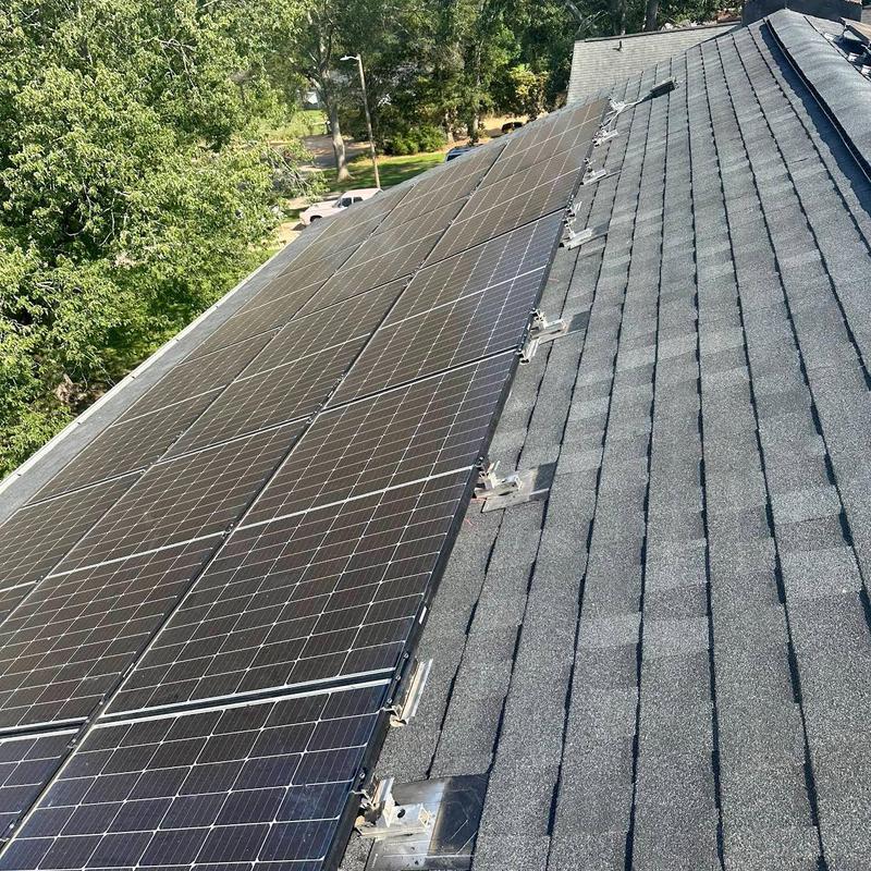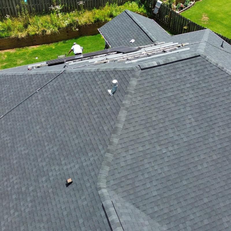 Consumer First Roofing replaced a roof using Atlas Pinnacle charcoal shingles in Spartanburg, South Carolina. The team removed existing solar panels, installed the new roof, and reinstalled the panels within two days. This process ensured minimal disruption while maintaining the function of the solar energy system.