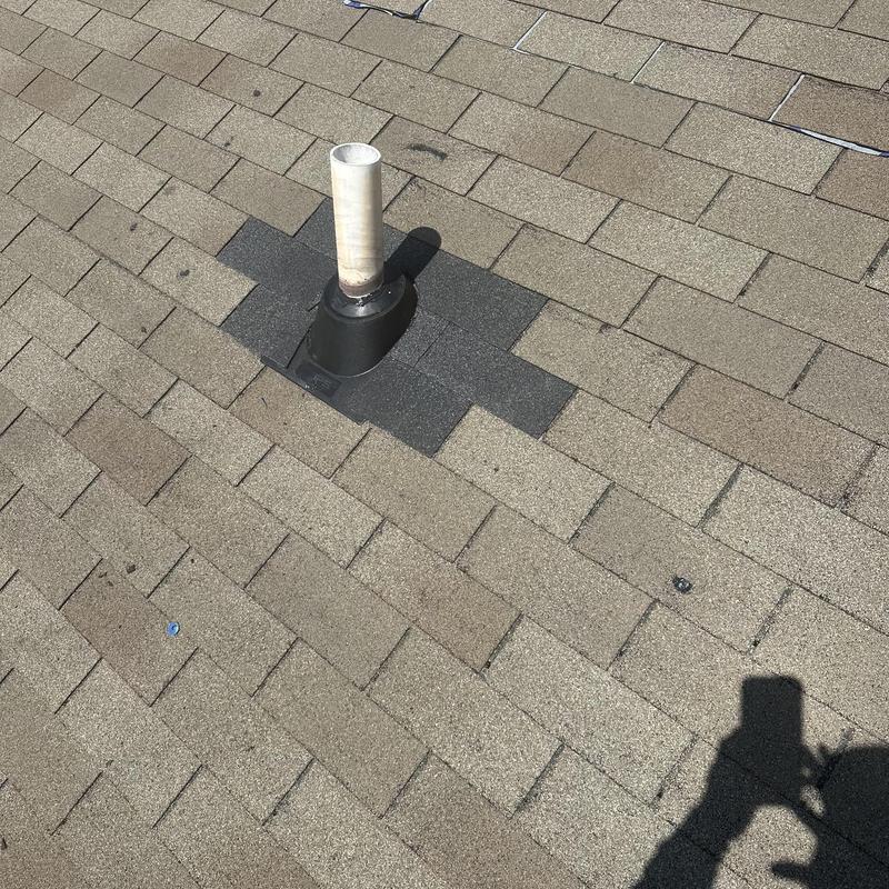 Consumer First Roofing repaired a broken attic pipe caused by previous plumbing work in Greenville, South Carolina. The team installed the correct replacement pipe, restored the shingles, and secured a new pipe boot along the roof.