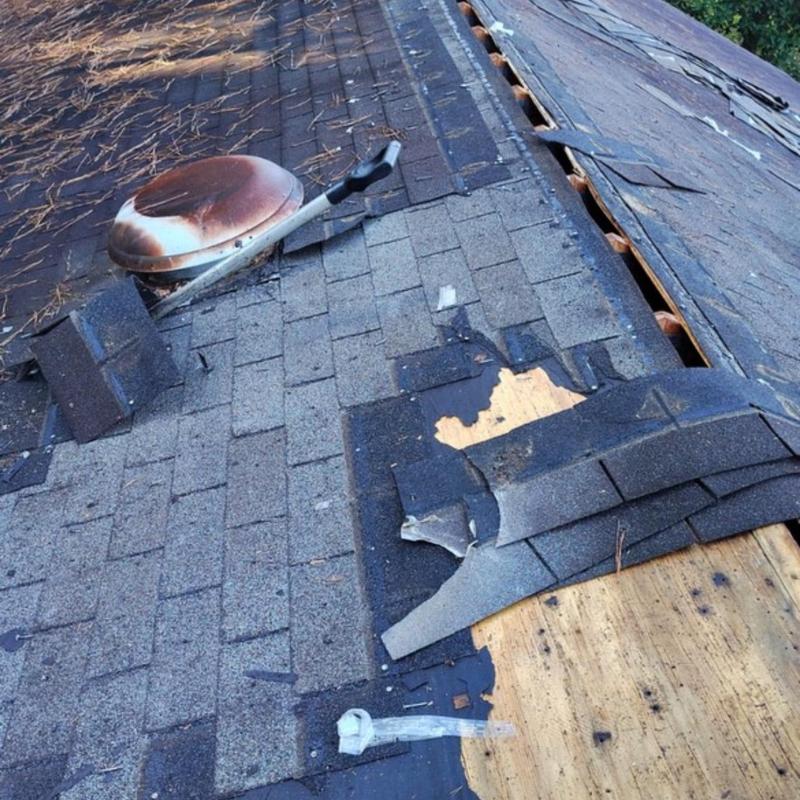 Consumer First Roofing replaced a damaged roof in Simpsonville, South Carolina after Hurricane Helene removed multiple shingles. The full roof replacement was completed in one day following insurance approval.