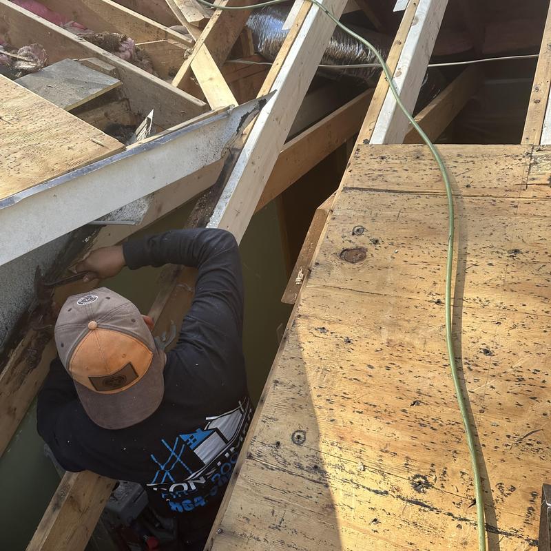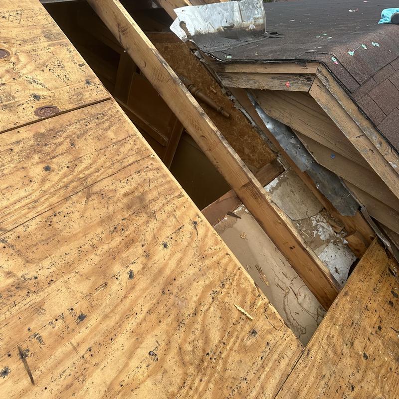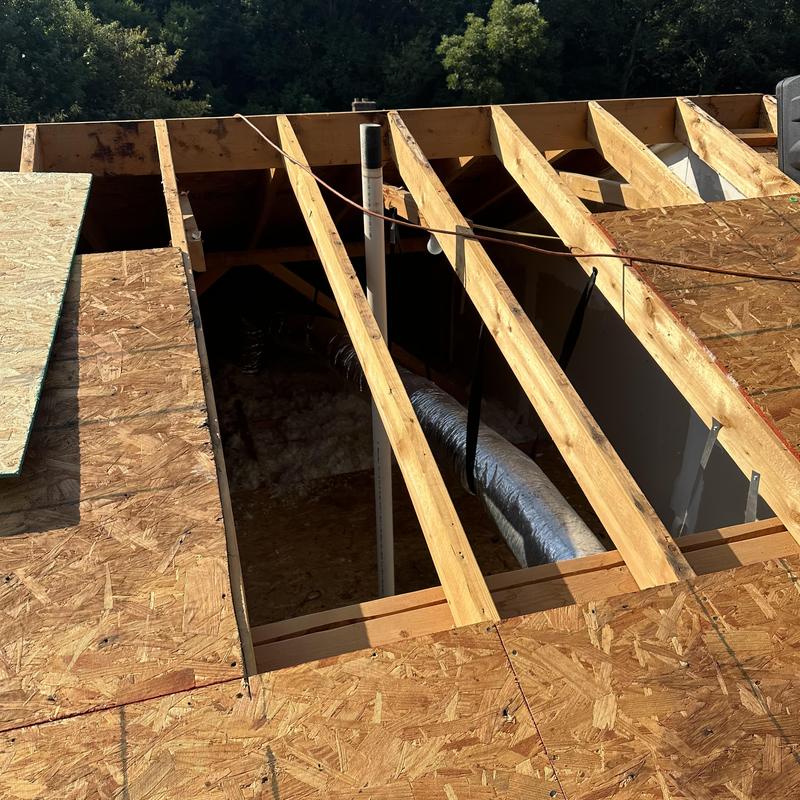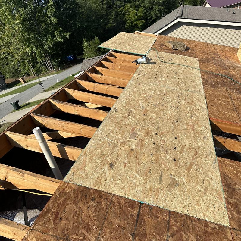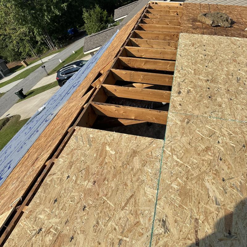 Consumer First Roofing completed structural roof repairs in Spartanburg, South Carolina. A fallen tree had damaged several rafters and sections of plywood. The crew replaced affected components to restore roof stability and protect the home from further damage.