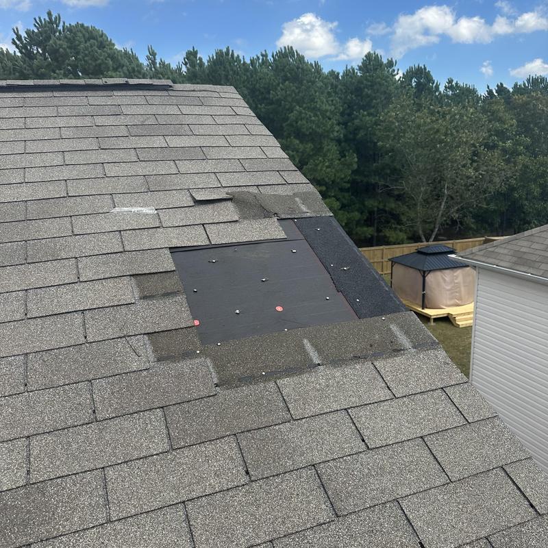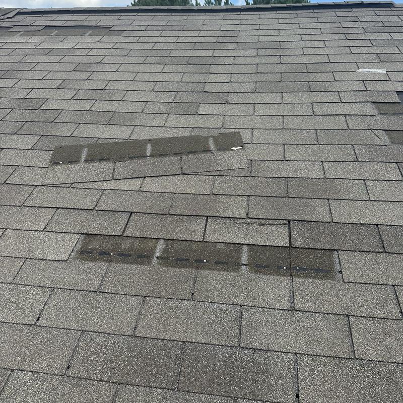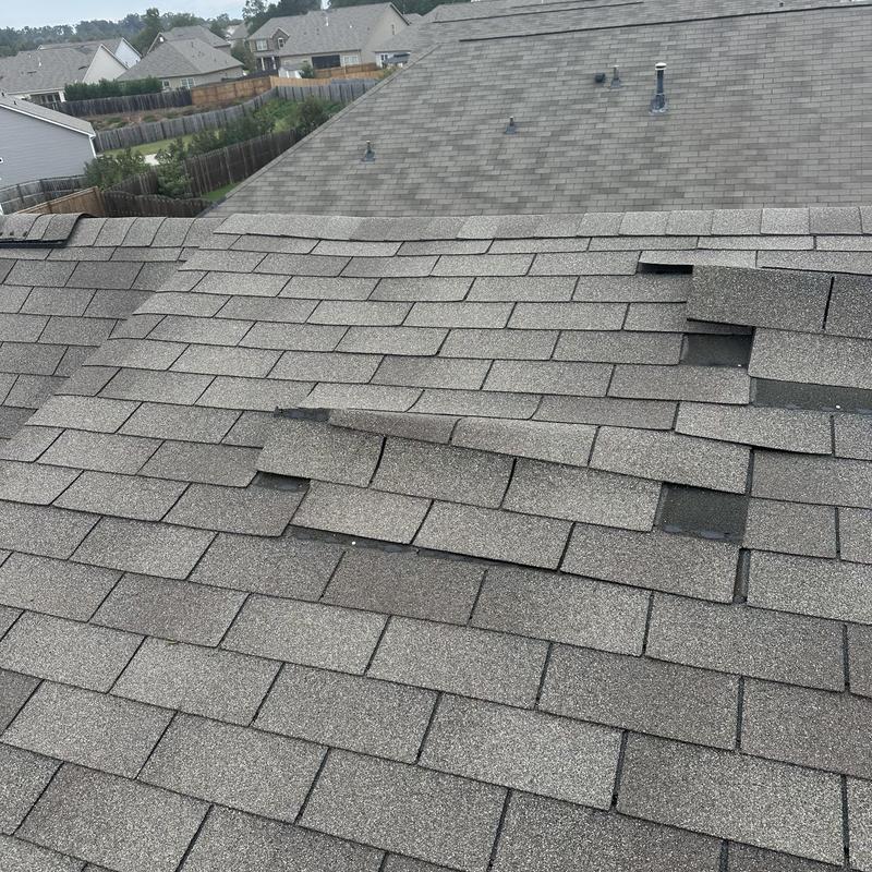 Consumer First Roofing repaired storm-damaged shingles in Duncan, South Carolina. The team replaced missing shingles that had blown off during severe weather, restoring the roof’s coverage and preventing further issues.