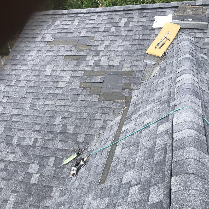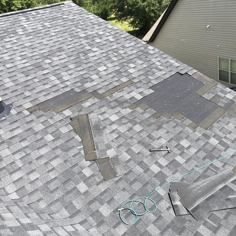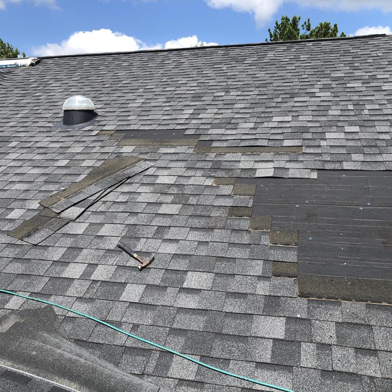 Consumer First Roofing replaced missing shingles on a residential roof in Simpsonville, South Carolina. High winds from a recent hurricane caused the damage. The crew completed the repair the same day to prevent further issues before the next rain.
